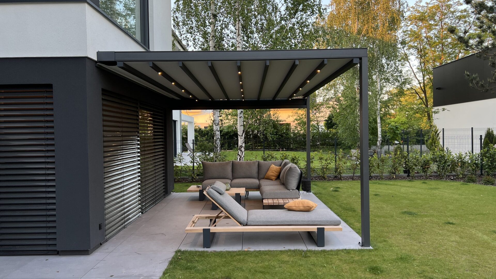 Zaawansowany system odprowadzania wody, zintegrowany w konstrukcji, eliminuje problem gromadzącej się wilgoci, co zwiększa trwałość pergoli i zapewnia jej użytkowanie bez względu na pogodę. Możliwość wyposażenia pergoli w dodatkowe osłony boczne, takie jak rolety screen, przeszklenia ze szkła czy żaluzje shuttersy, sprawią, że przestrzeń staje się bardziej prywatna i komfortowa, a jednocześnie lepiej chroniona przed wiatrem i innymi czynnikami atmosferycznymi.