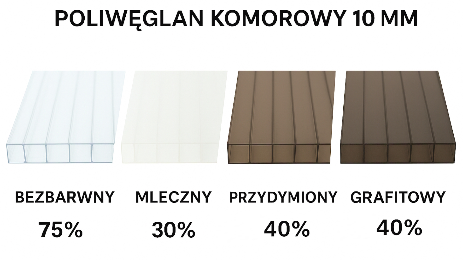 Poliwęglan komorowy 10 mm dostępny jest w kilku wariantach kolorystycznych, różniących się stopniem przepuszczalności światła: