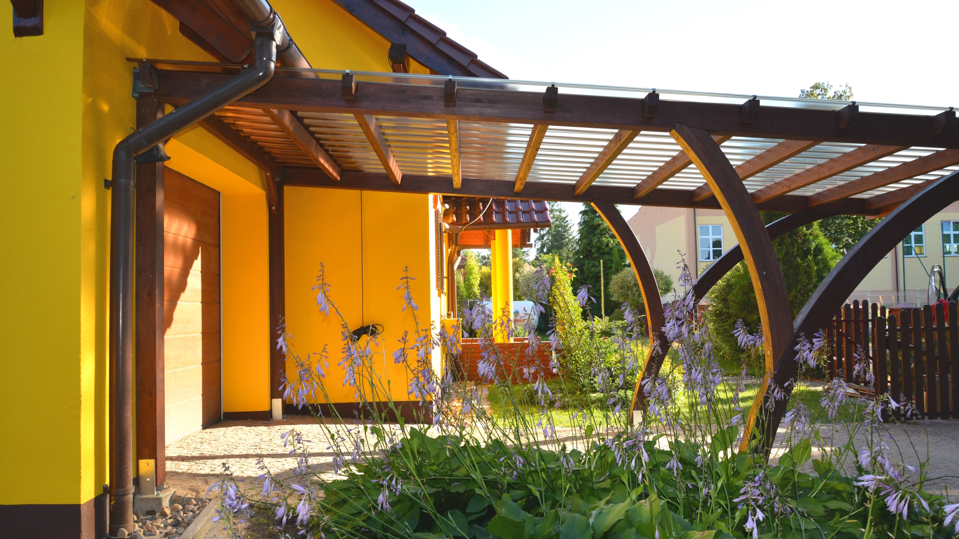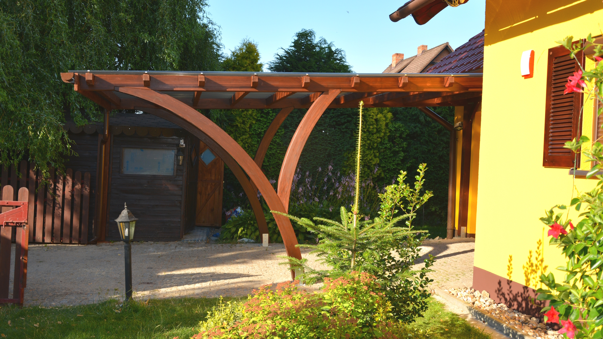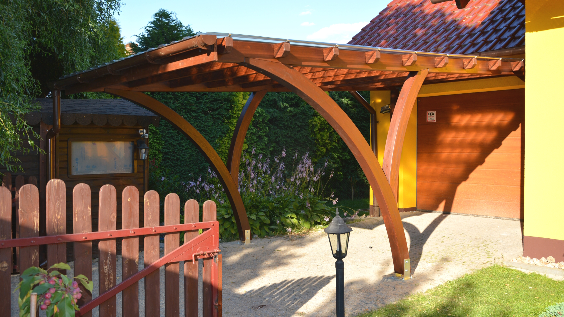 Zadaszenie zaprojektowane zostało zgodnie z najnowszymi normami na obciążenie śniegiem i wiatrem. Podstawowe przekroje elementów konstrukcji: element nośny 15x12cm, słupki tylne 12x12cm, łata górna 12x6cm, elementy łukowe 14x12cm. Wiatę garażową możemy wykonać na dowolny wymiar.