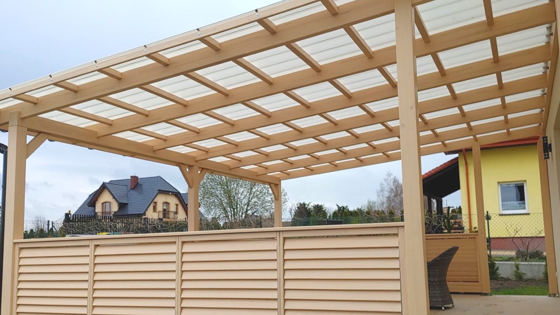 | Dymiony (przyciemniany / brązowy) | ~60–65 % | Ogranicza nasłonecznienie i nagrzewanie, nadaje zadaszeniu elegancki, nowoczesny wygląd. |
