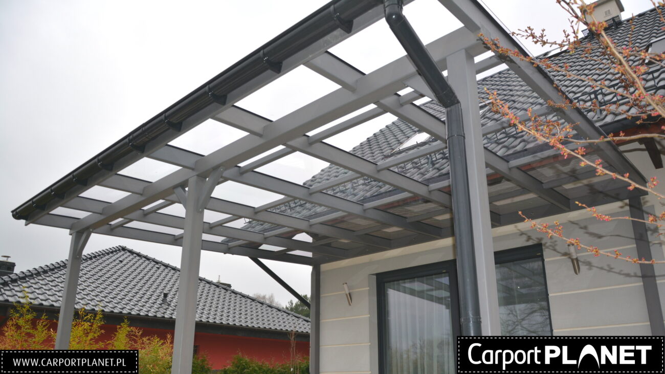 Zadaszenie zaprojektowane zostało zgodnie z najnowszymi normami na obciążenie śniegiem i wiatrem. Podstawowe przekroje elementów konstrukcji: element nośny 14×5,5cm, słupki 12x12cm, łata górna 6×5,5cm, łata na słupach 15x12cm, łata przyścienna 15×5,5cm. Zadaszenie tarasu możemy wykonać na dowolny wymiar.