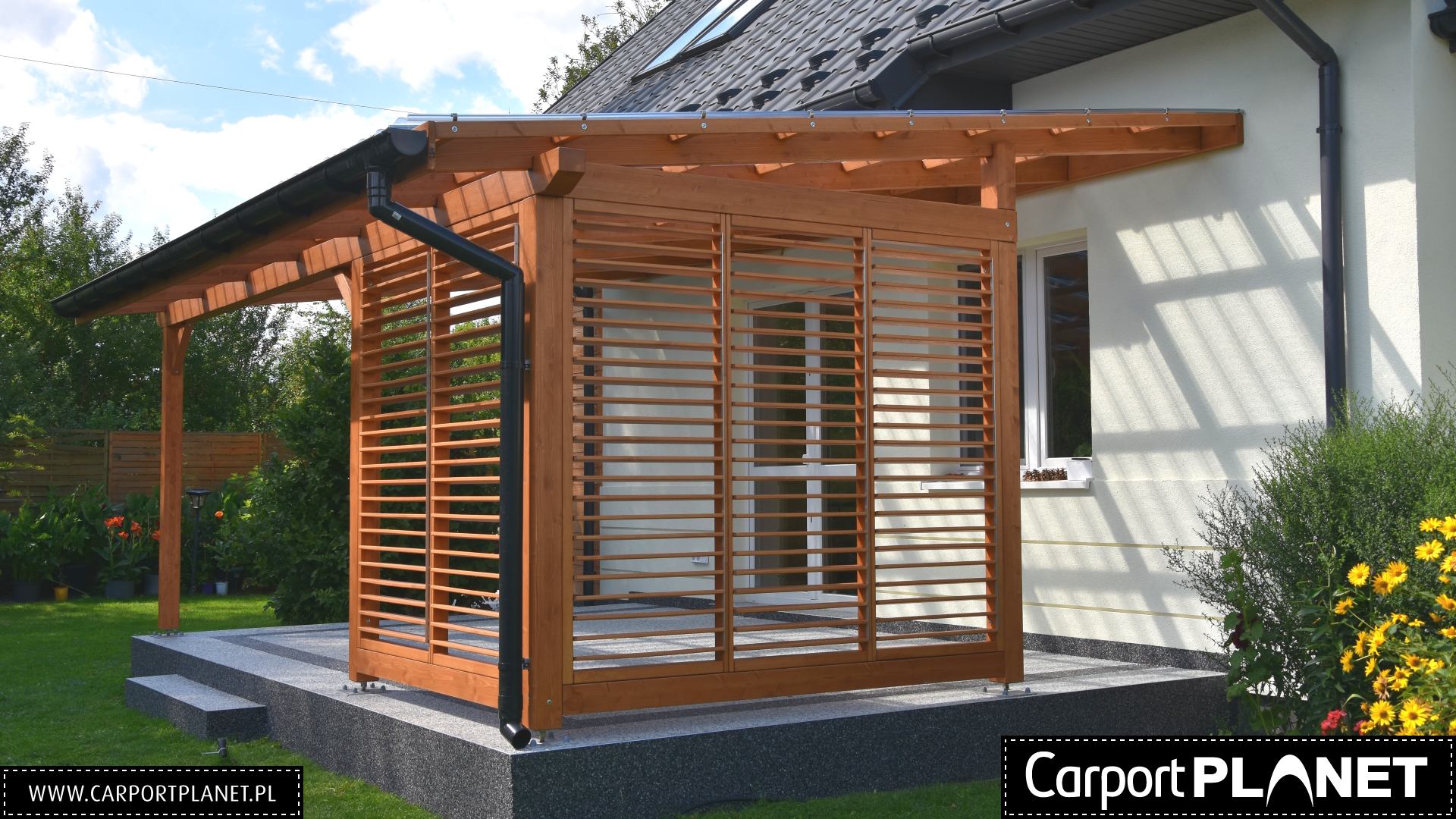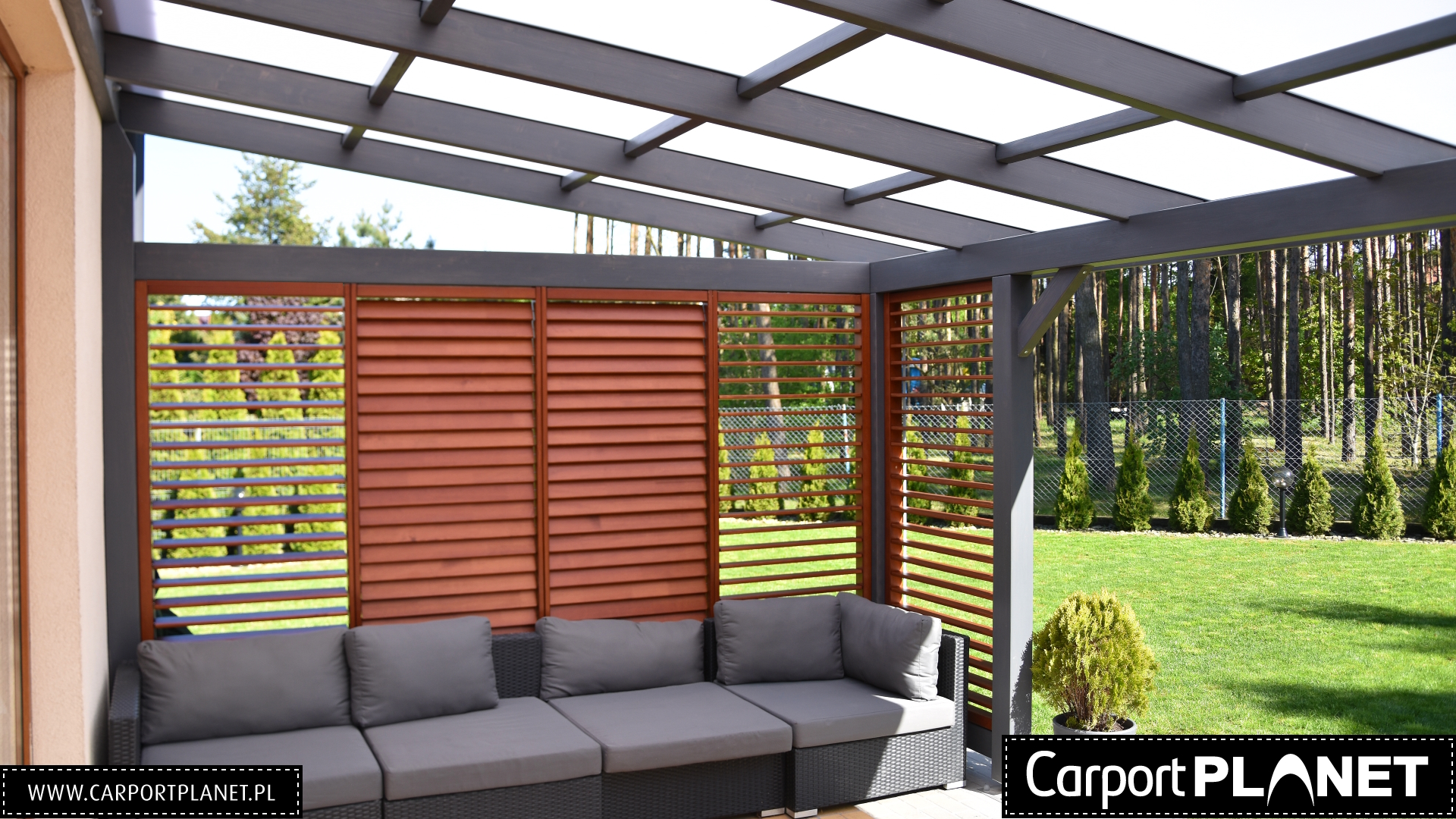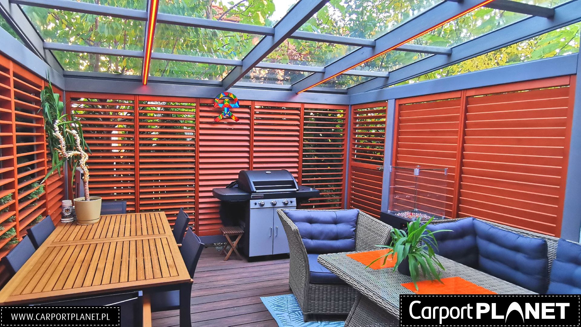 Nowoczesne żaluzje z regulowanymi lamelami to idealne uzupełnienie zadaszenia tarasu. Umożliwiają płynną kontrolę nad ilością światła i prywatnością — wystarczy obrócić lamele, by uzyskać pożądany poziom nasłonecznienia lub całkowite zacienienie. Wykonane z wytrzymałego aluminium, odporne na warunki atmosferyczne i łatwe w utrzymaniu czystości. Dostępne w różnych kolorach dopasowanych do konstrukcji zadaszenia.